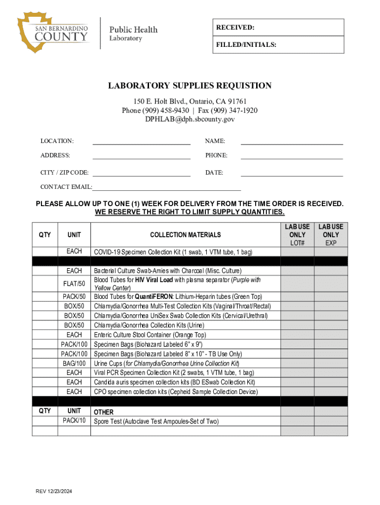 This document is used to requisition various laboratory supplies, including specimen collection kits and other materials necessary for testing and diagnosis.