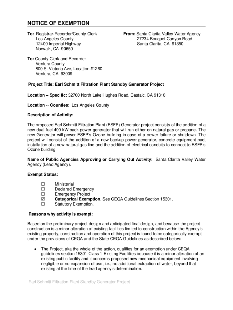 This document serves as a notice of exemption for the Earl Schmitt Filtration Plant Standby Generator Project, detailing its location, description of the activity, and the reasons why it qualifies