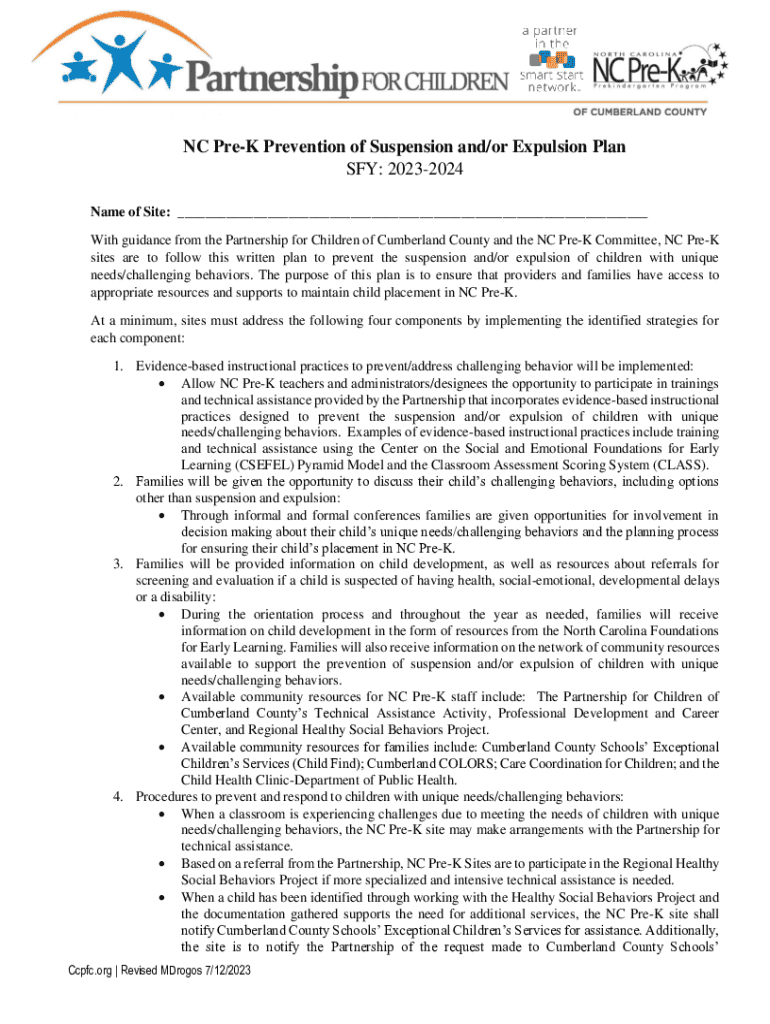 Get the free Nc Pre-k Prevention of Suspension and/or Expulsion Plan