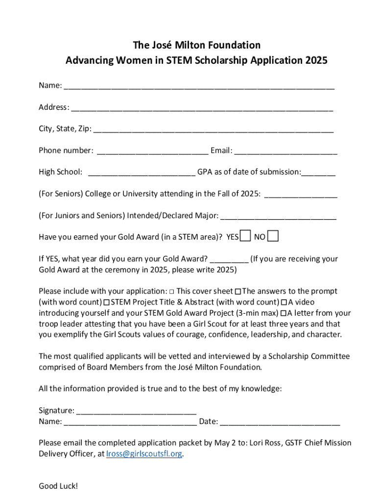 Get the free José Milton Foundation Advancing Women in Stem Scholarship Application 2025