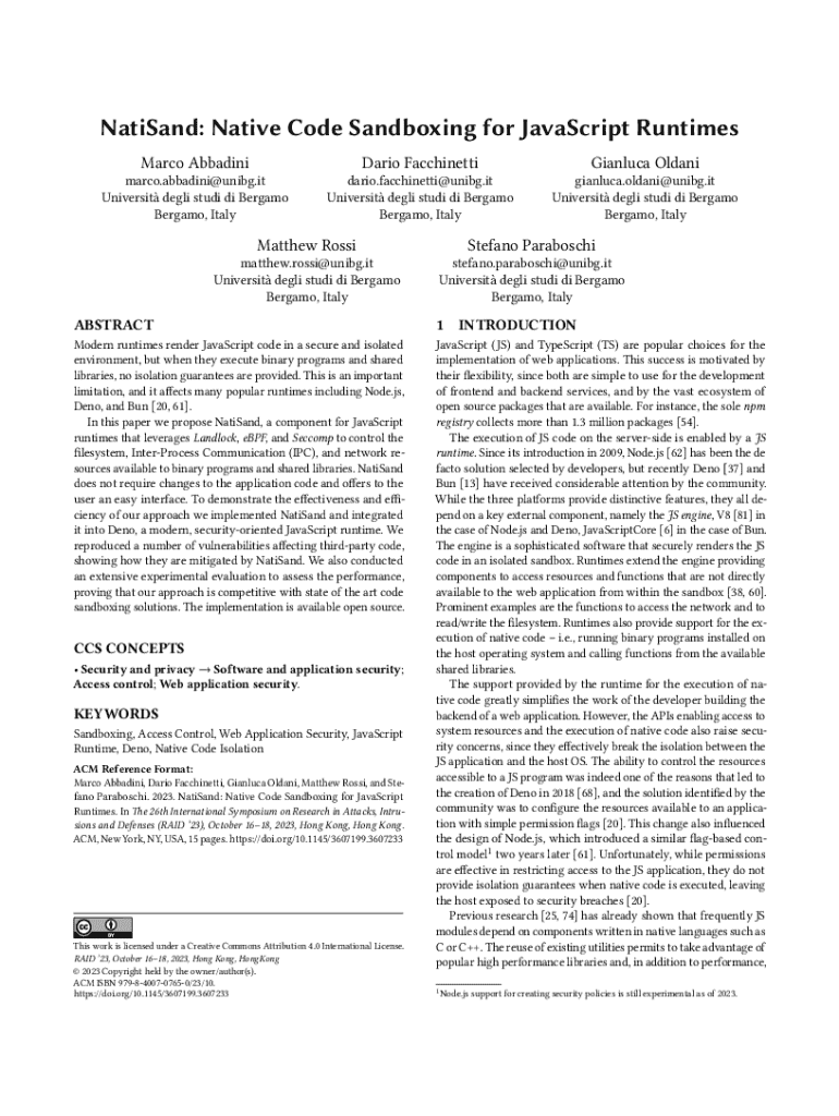 This document presents NatiSand, a security component designed for JavaScript runtimes to provide strong isolation for executing binary programs and shared libraries, addressing security vulnerabilities
