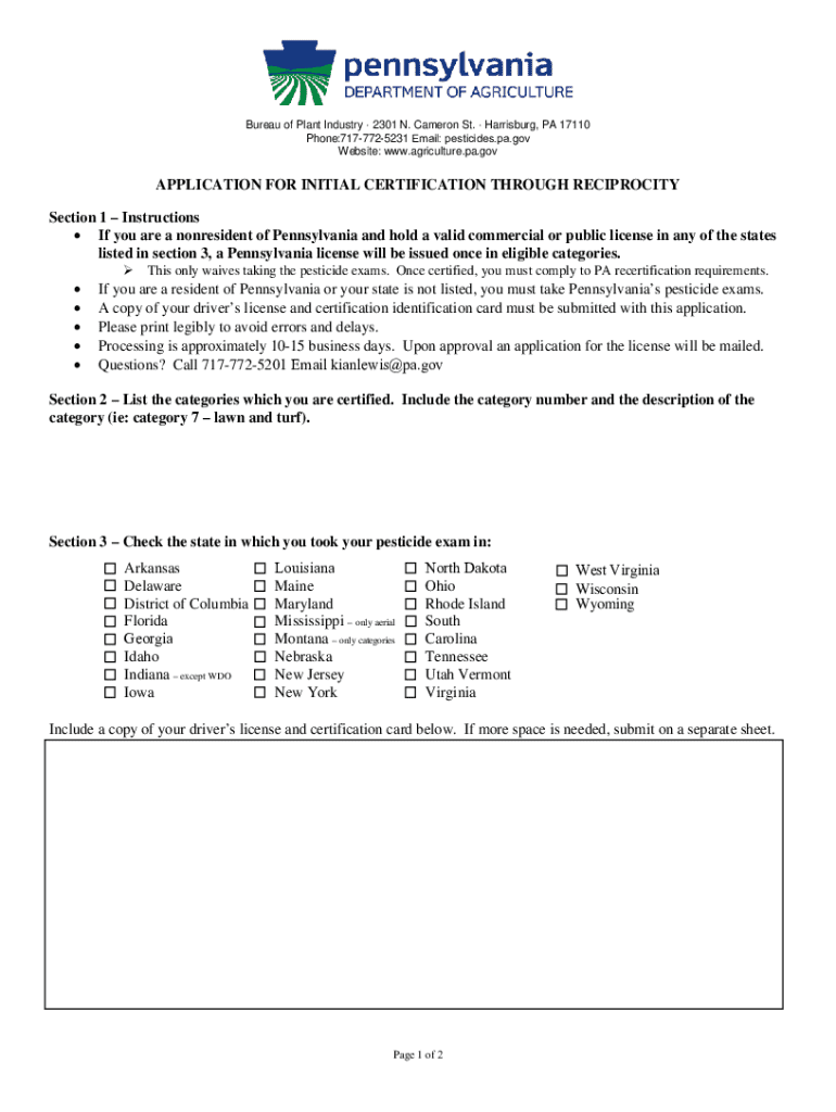 This document is an application for individuals seeking initial certification for pesticide handling in Pennsylvania through reciprocity with other states, providing instructions and required information.