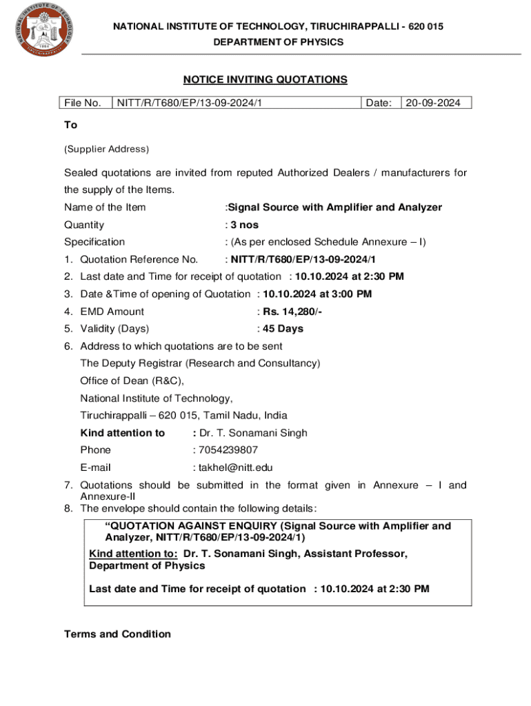 This document invites sealed quotations from authorized dealers and manufacturers for the supply of Signal Source with Amplifier and Analyzer at the National Institute of Technology, Tiruchirappalli.
