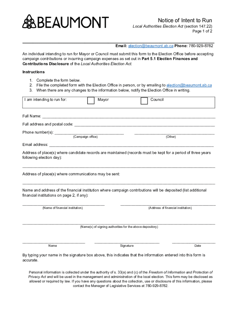 Get the free Notice of Intent to Run