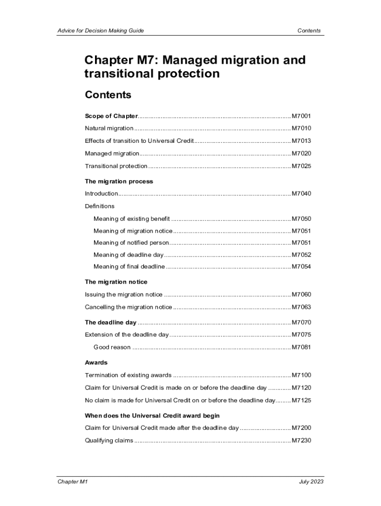 This document provides comprehensive guidance on managed migration and transitional protection under Universal Credit, detailing the migration process, definitions of key terms, and conditions for
