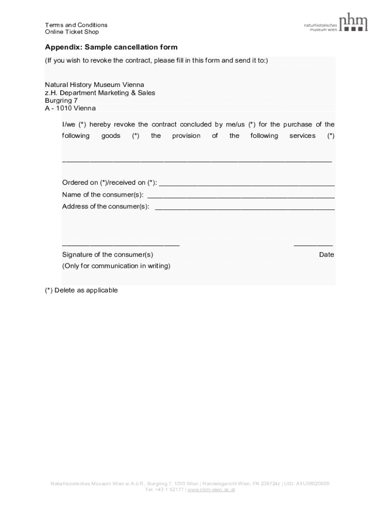 This document outlines the terms and conditions for purchasing tickets online, including a sample cancellation form to revoke contracts.