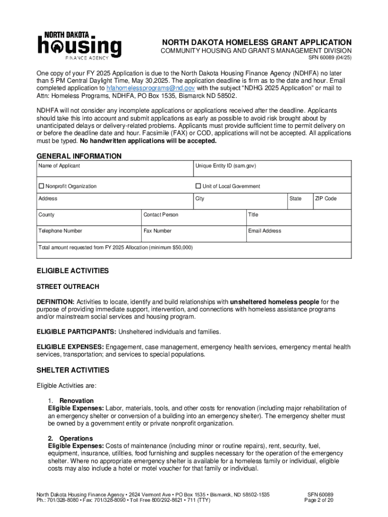 The North Dakota Homeless Grant Program aims to provide essential support to individuals and families facing homelessness. Through various funding mechanisms, the program addresses immediate needs such as shelter and transitional housing.