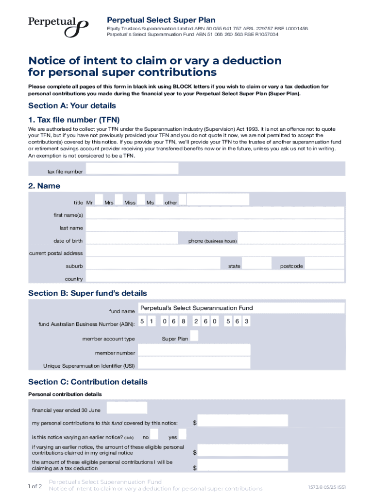Get the free Notice of Intent to Claim or Vary a Deduction for Personal Super Contributions