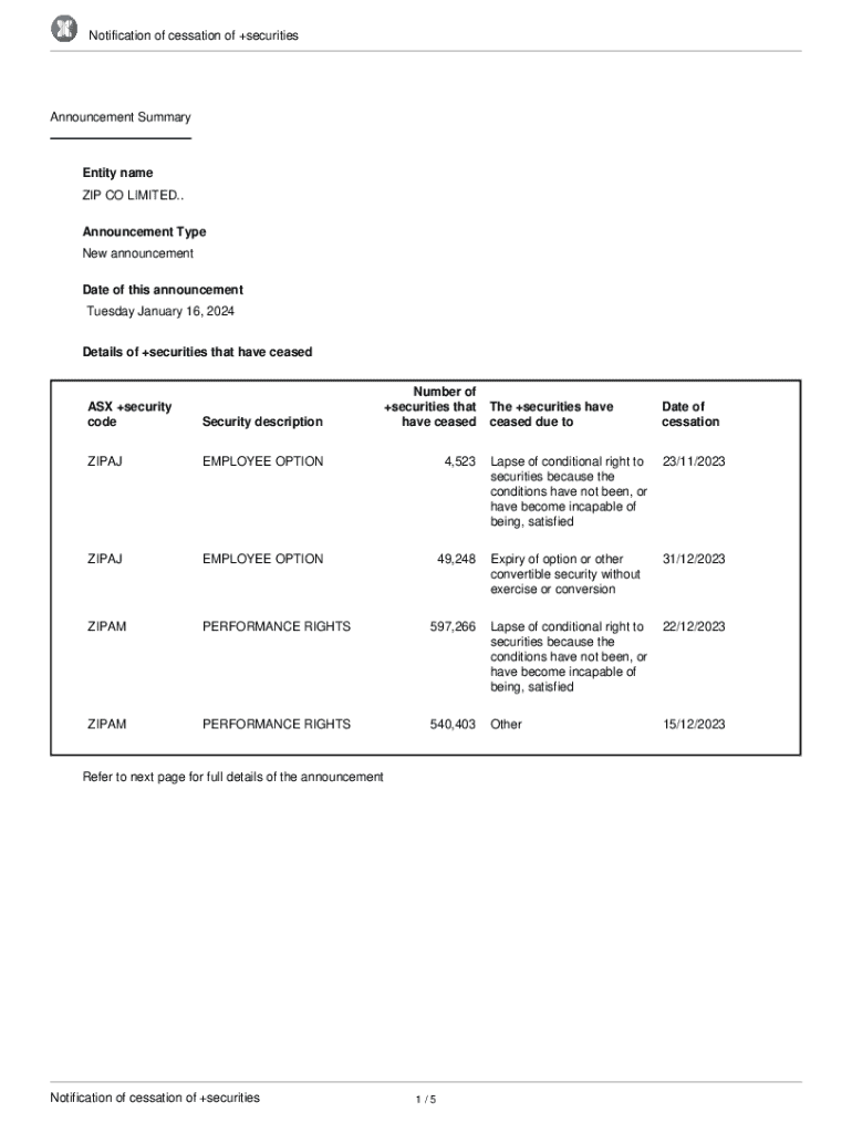 This document provides details regarding the cessation of certain securities by ZIP Co Limited, including reasons for cessation, the number of securities affected, and dates of cessation.
