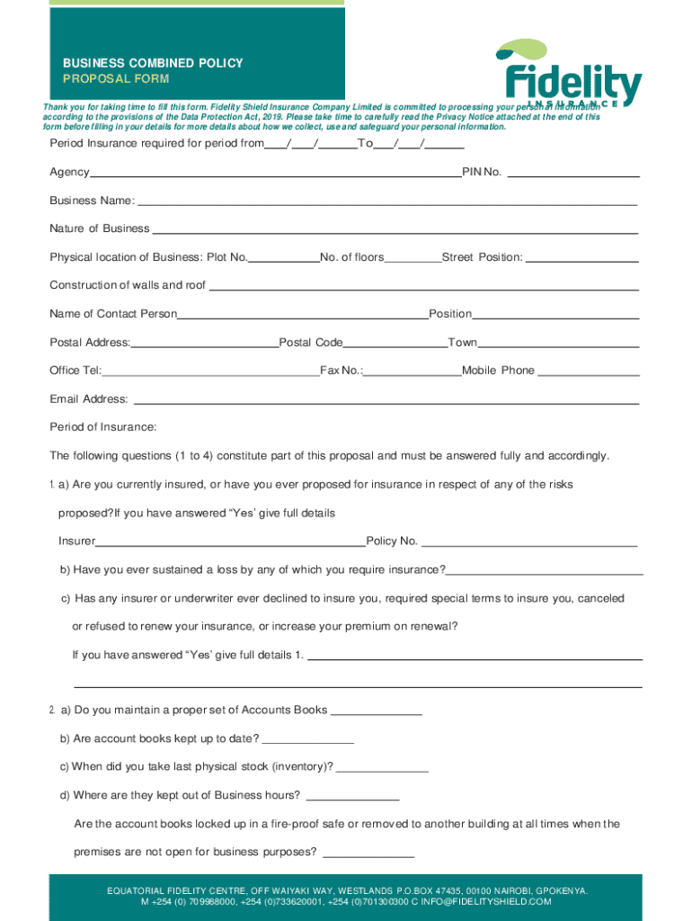 This document serves as a proposal form for the Business Combined Policy offered by Fidelity Shield Insurance Company Limited, collecting detailed information for the purpose of insuring businesses.