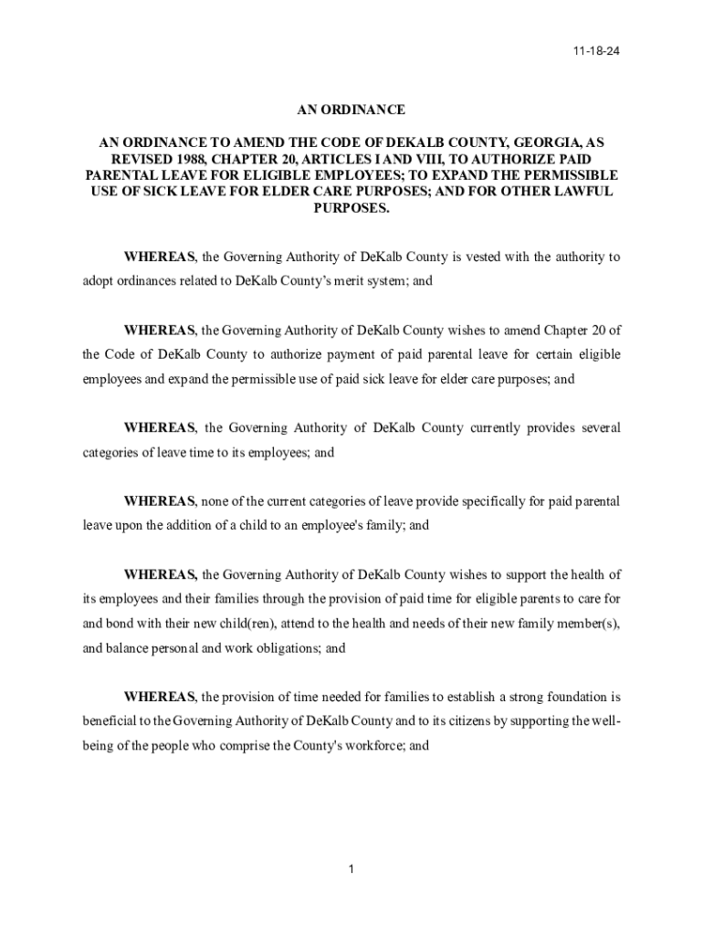 This ordinance amends the Code of DeKalb County to authorize paid parental leave for eligible employees and expand the permissible use of sick leave for elder care purposes.