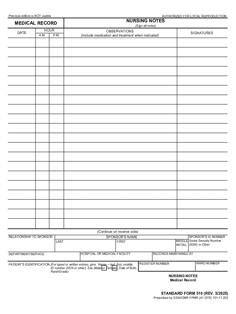 This document is used to record nursing notes in a patient\'s medical record, including observations, medications, and treatments.