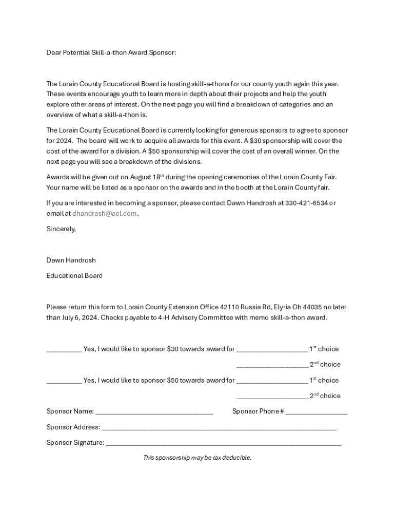This document invites sponsors to support the skill-a-thon awards for youth in Lorain County, detailing sponsorship levels and benefits, as well as providing a form for sponsors to indicate their