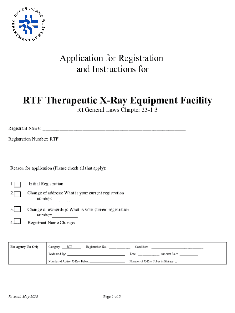 This document serves as an application and instruction manual for registering a therapeutic X-ray equipment facility in Rhode Island, including requirements for contact information, ownership, and
