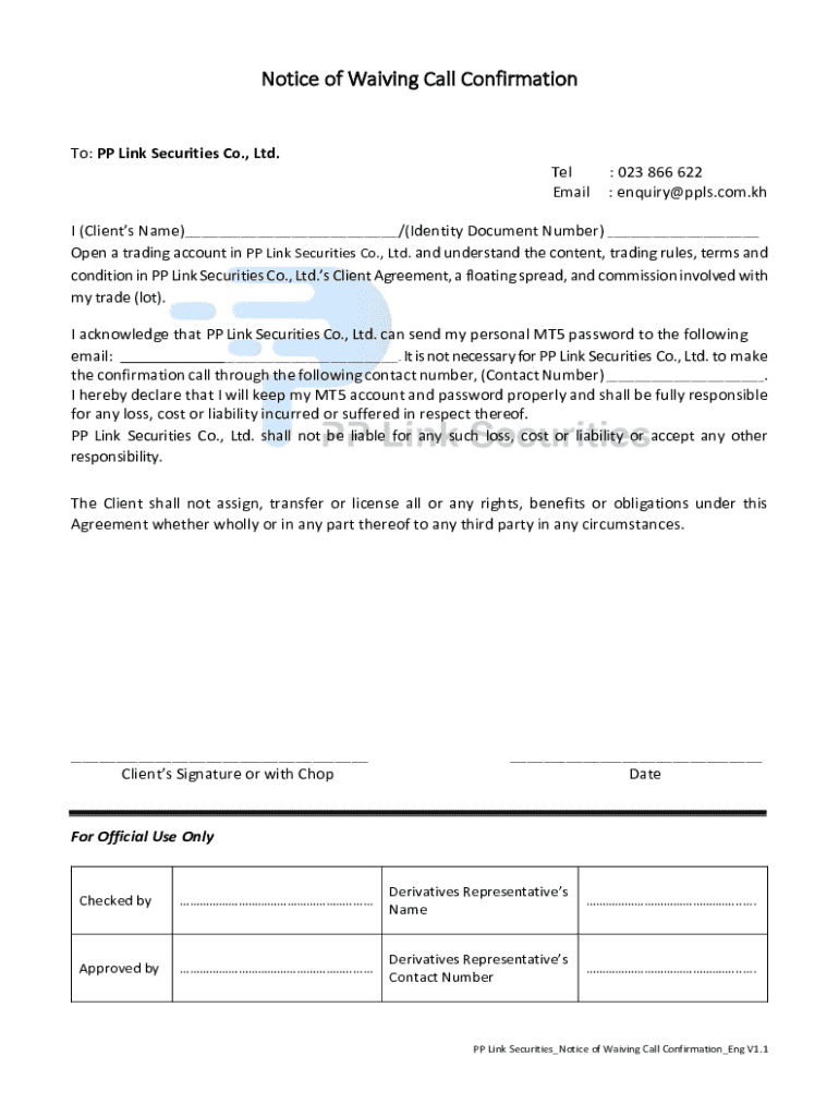 This document serves as a notice for the client of PP Link Securities Co., Ltd. to waive the confirmation call regarding the trading account and confirms understanding of the terms associated with