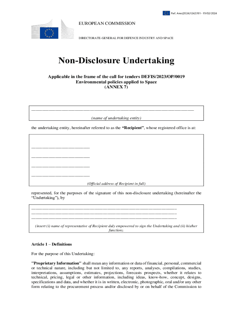Get the free Non-Disclosure Undertaking. Applicable in the frame of the call for tenders DEFIS/20...