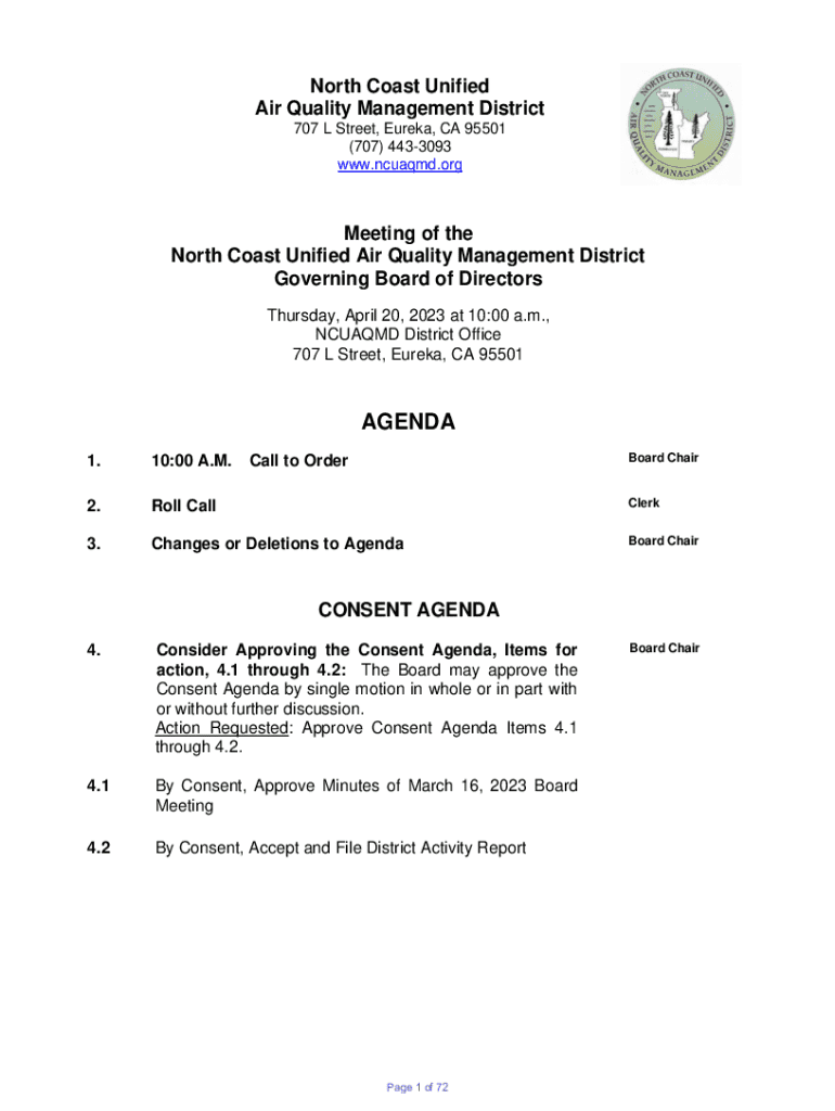 Get the free North Coast Unified Air Quality Management District Governing Board Meeting Agenda