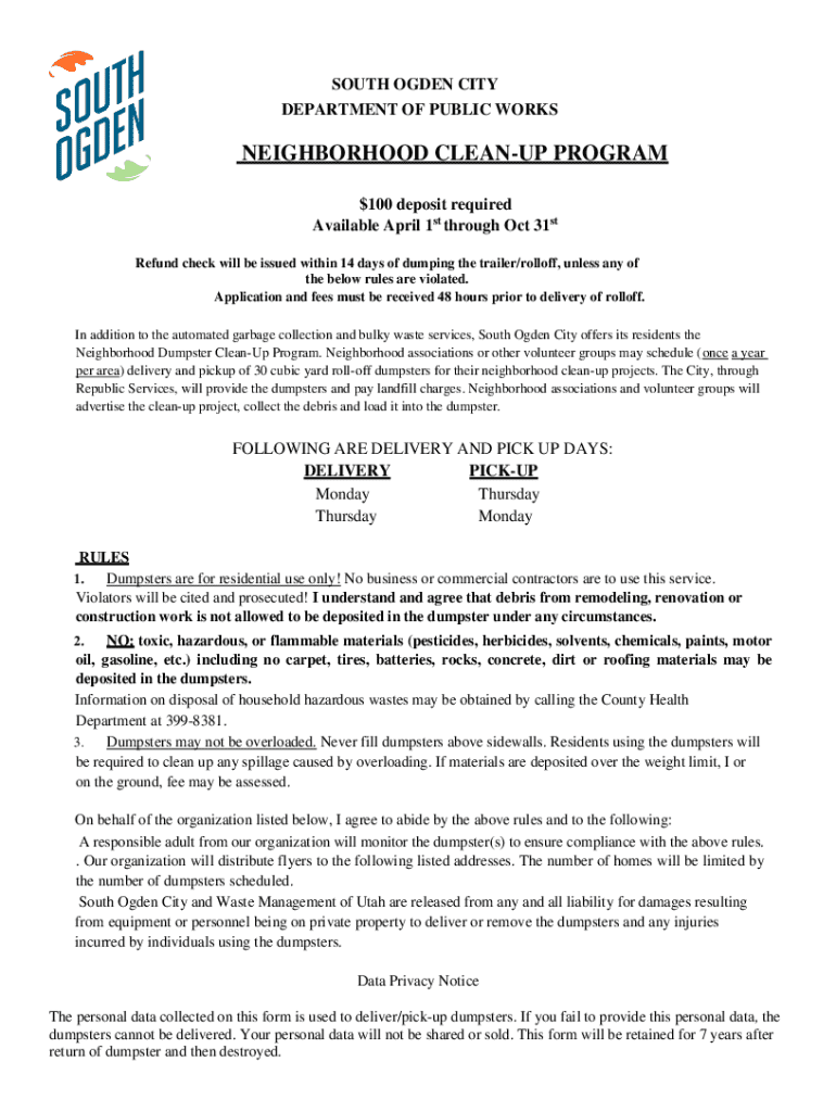 Application for the Neighborhood Clean-Up Program in South Ogden City, detailing rules, requirements, and procedures for booking a dumpster for community clean-up projects.