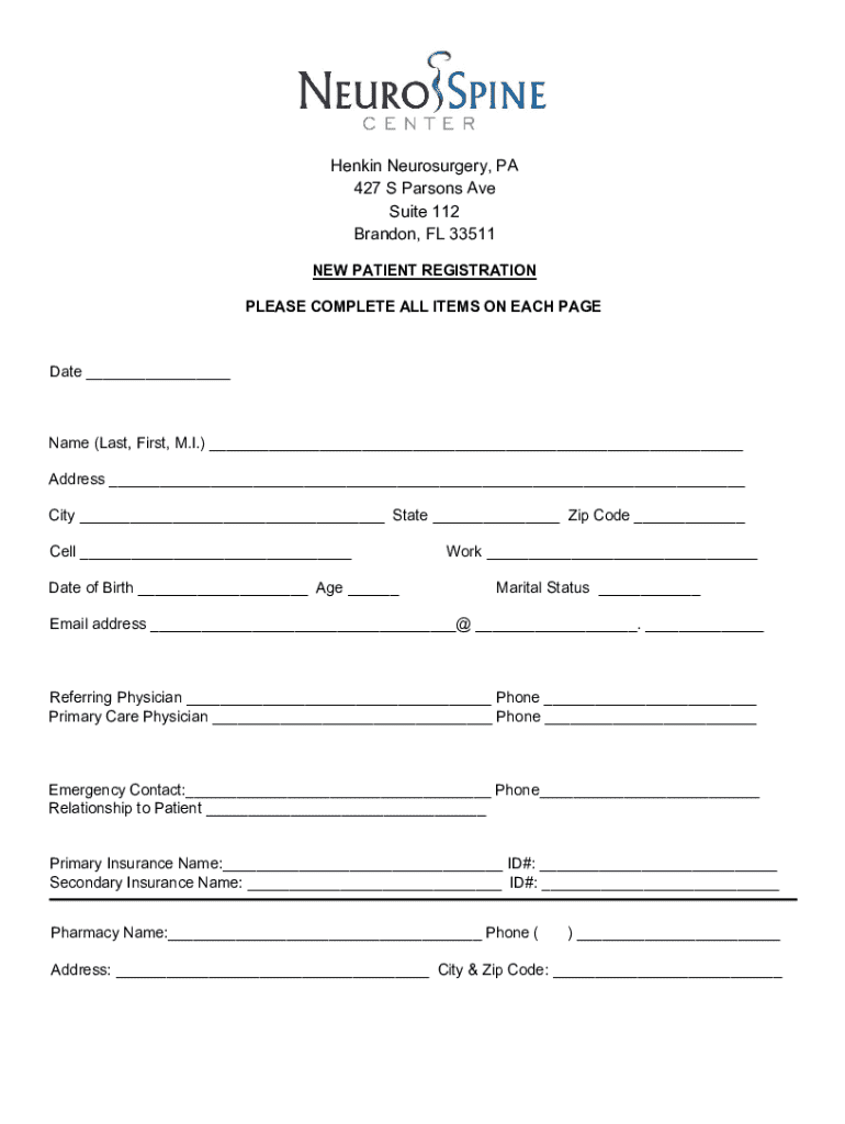 This document is a registration form for new patients at Henkin Neurosurgery, collecting essential personal, insurance, and contact information.