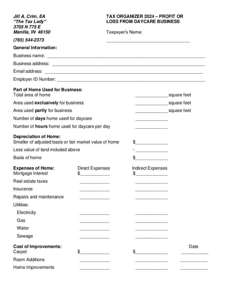 Get the free Tax Organizer 2024 – Profit or Loss From Daycare Business