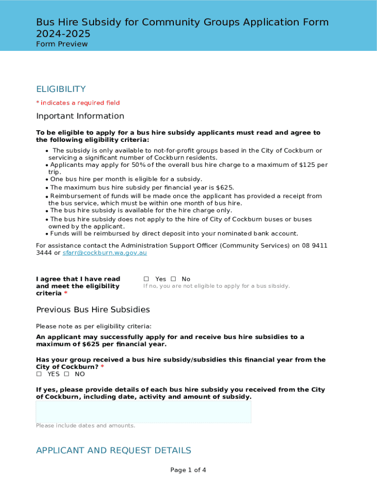 This document outlines the application process for community groups seeking a bus hire subsidy from the City of Cockburn. It details eligibility criteria, application requirements, and certification