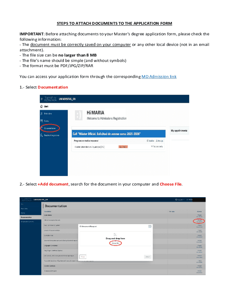 This document provides a guideline for applicants on how to attach necessary documents to the Master\'s degree application form, including requirements for file size, naming conventions, and allowed