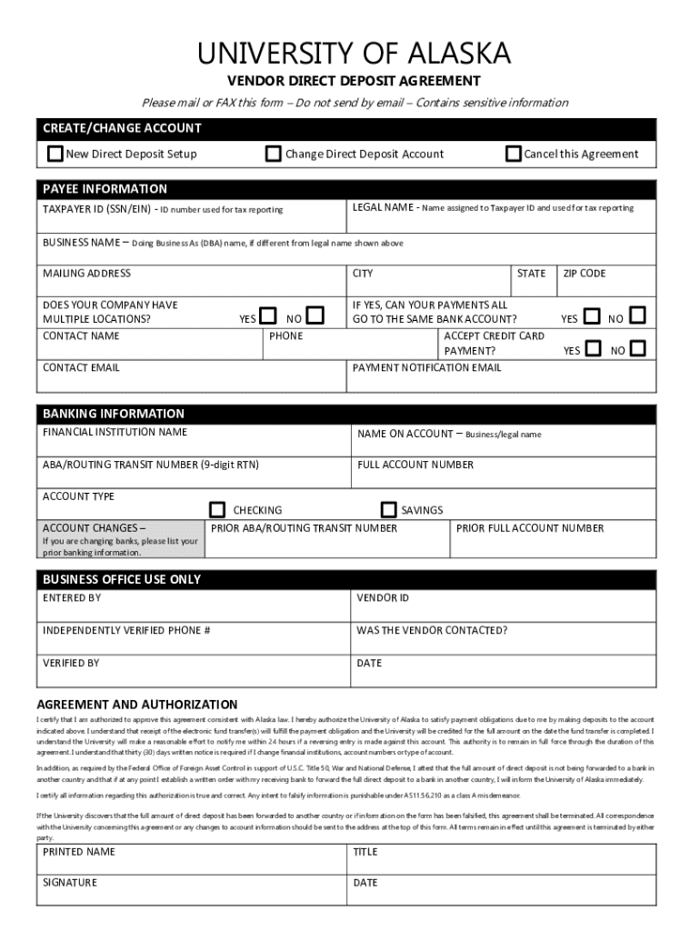 Get the free University of Alaska Vendor Direct Deposit Agreement