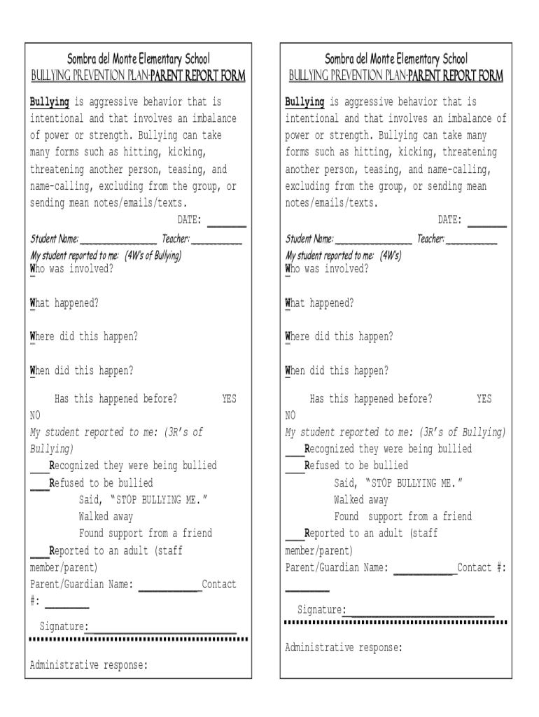 Get, Create, Make and Sign bullying prevention plan-parent report