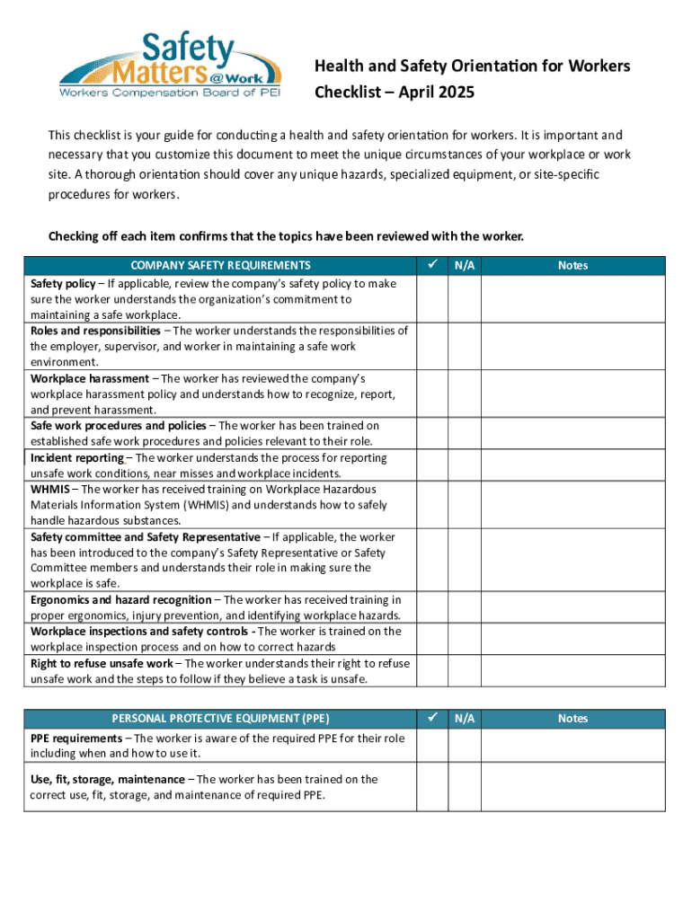 This checklist serves as a guide for conducting a health and safety orientation for workers, ensuring they understand workplace safety policies, procedures, and their responsibilities.