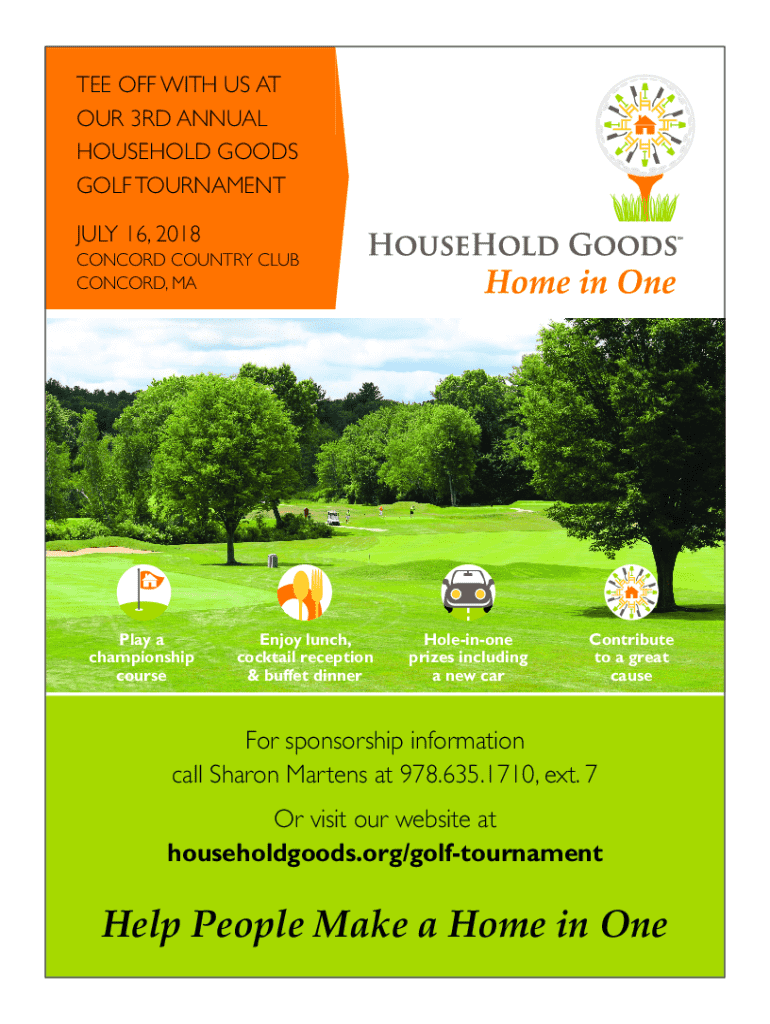 This document outlines the details for the 3rd Annual Household Goods Golf Tournament, including sponsorship opportunities, event schedule, and registration information.