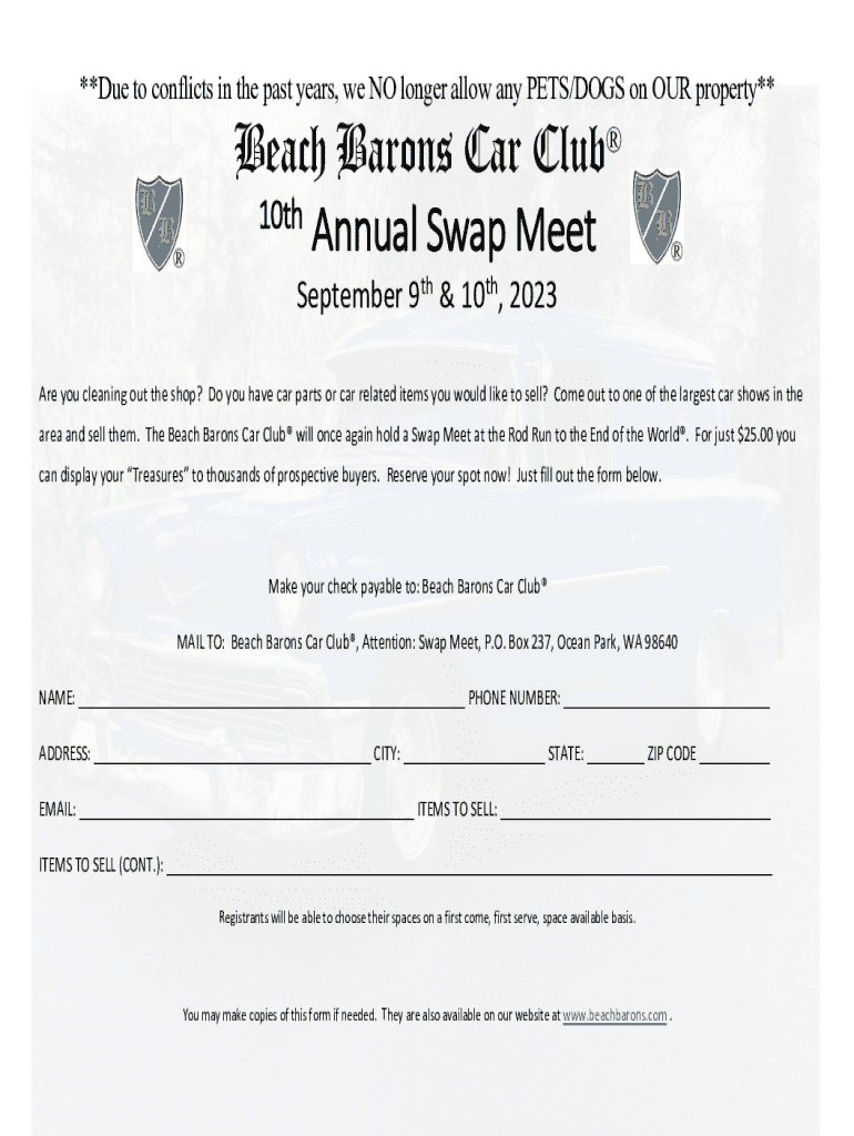 This document serves as a registration form for the Beach Barons Car Club® 10th Annual Swap Meet, providing details on how to participate by selling car parts or related items.