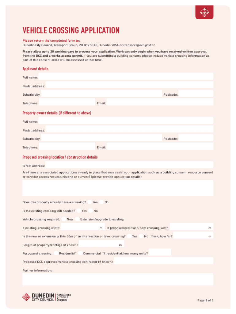 This document is an application for a vehicle crossing permit, which must be returned to the Dunedin City Council for processing. It requires details about the applicant, property, proposed crossing,