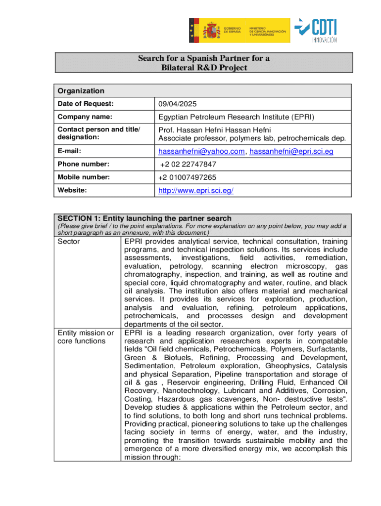 Get the free Search for a Spanish Partner for a Bilateral R&d Project