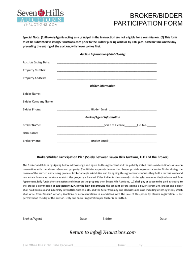 The broker bidder participation form is an essential document in real estate transactions, designed to formalize the relationship between buyers, brokers, and sellers. It not only outlines the details of the bidding process but also ensures that all parties understand their roles and responsibilities in the transaction. Without this form, bidders may be at a disadvantage, lacking critical information that could affect their bids.