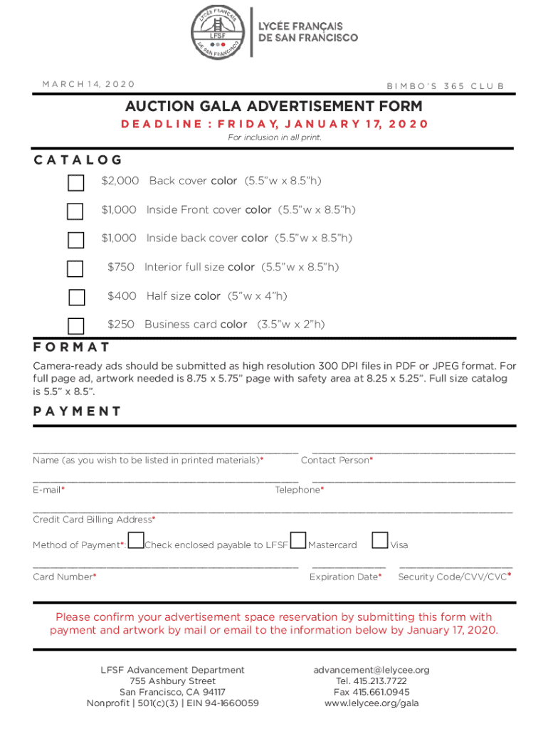 Form for advertisers to reserve advertisement space in the catalog for the Annual Gala of Lycée Français de San Francisco, including payment details and advertisement options.