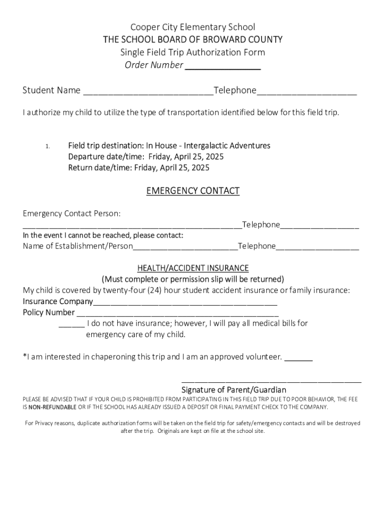 Get the free Single Field Trip Authorization Form
