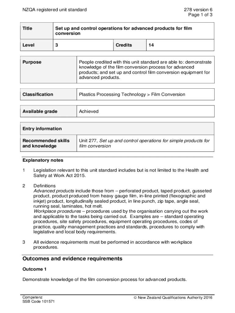 This document outlines the unit standard for setting up and controlling operations for advanced products in film conversion. It includes objectives, skills required, evidence requirements, and regulatory