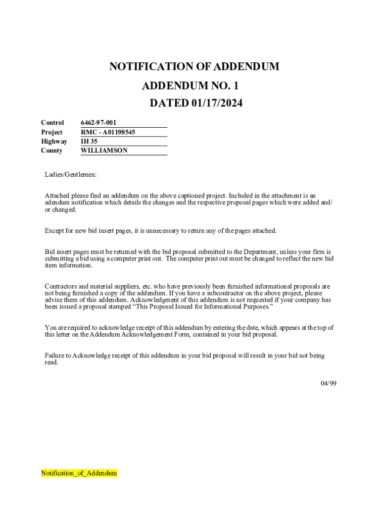 This document serves as an addendum notification for the project RMC - A01198545 IH 35, detailing changes and proposal pages that were added or altered in the bidding process.