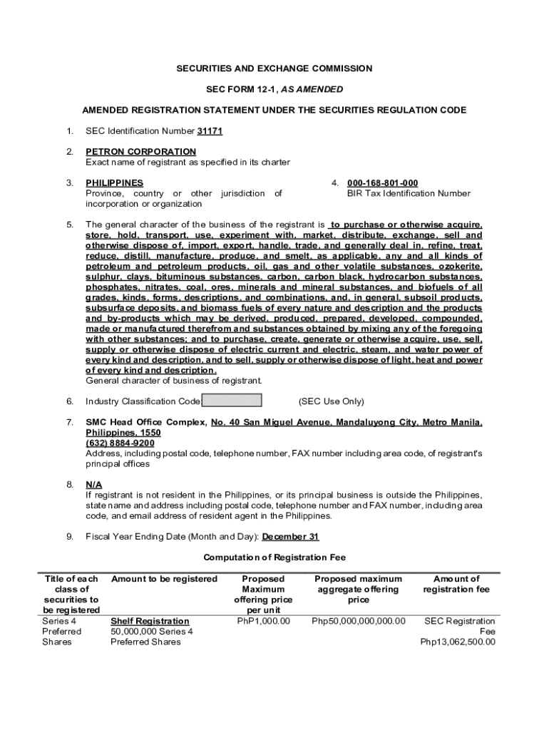 This document serves as an amended registration statement for SEC Form 12-1 filed by Petron Corporation, detailing its business activities, financial projections, and obligations related to the issuance