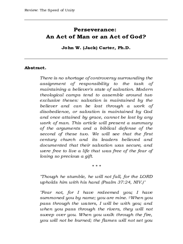 The document presents a theological exploration of the concepts of perseverance and salvation, discussing the tension between Calvinism and Arminianism, and examining biblical passages related to