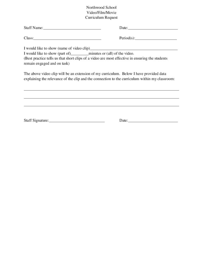 Get the free Northwood School Video/film/movie Curriculum Request