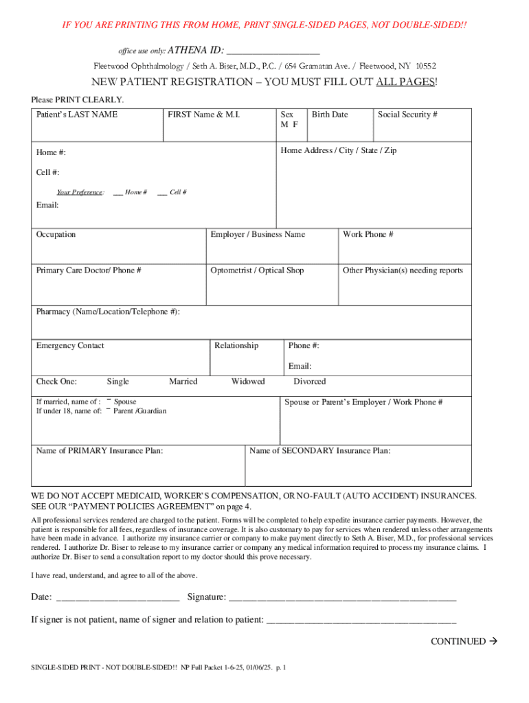 This document is used for new patients to register at Fleetwood Ophthalmology, capturing essential personal, insurance, and medical history information.