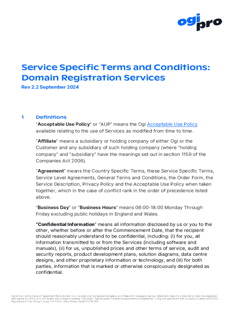 This document outlines the specific terms and conditions applicable to the Domain Registration Services provided by Ogi, including definitions, service charges, rights and responsibilities, and additional
