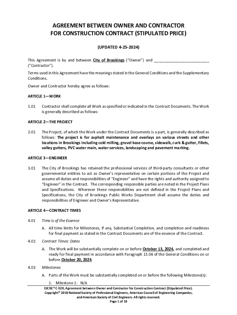 This document outlines the agreement between the City of Brookings (Owner) and the Contractor for the construction project involving asphalt maintenance and overlays, including various related works.