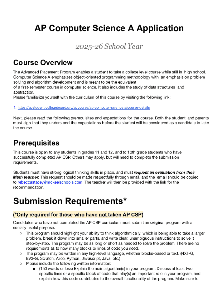 Before you begin filling out the AP Computer Science A Form, it's essential to collect all necessary documents that outline your academic background and readiness for the course. This may include your previous report cards, details of any prior computer science courses you've taken, and your general student information.