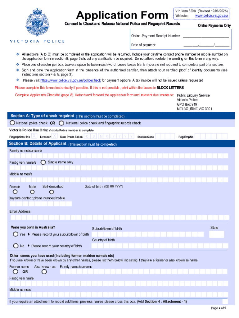 This document is an application form for consenting to a National Police Check and Fingerprint Records check conducted by Victoria Police. It outlines the process for completion, required identification,