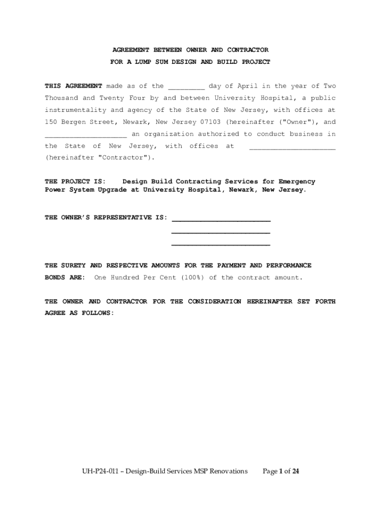 This document serves as an agreement between University Hospital and the Contractor for design-build contracting services, specifically for the Emergency Power System Upgrade at University Hospital,