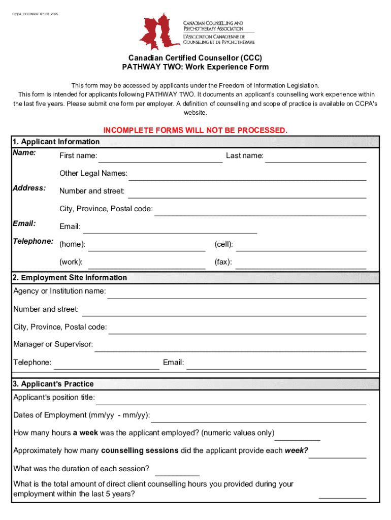 This form is intended for applicants following PATHWAY TWO to document their counselling work experience within the last five years. It is required to submit one form per employer.