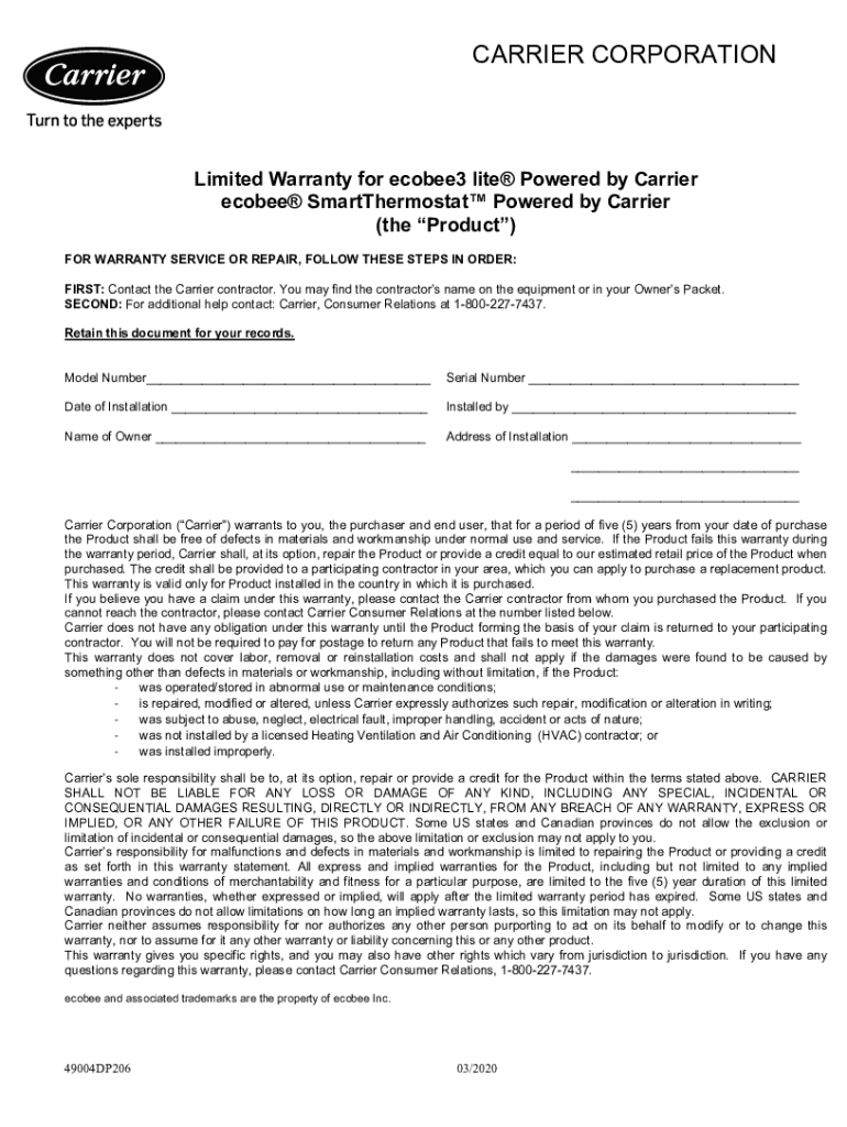 Get the free Limited Warranty for Ecobee3 Lite® Powered by Carrier