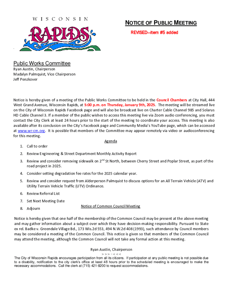 El presente documento es un aviso de una reunión del Comité de Obras Públicas que se llevará a cabo en el Ayuntamiento de Wisconsin Rapids, donde se discutirá la actividad mensual del Departamento